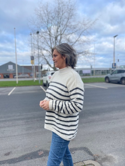 CARRIE is a new striped winter pullover with round neck and long sleeves.The delicate baby alpaca makes the knit super soft and comfortable. The knit is a bit longer at the back than at front.