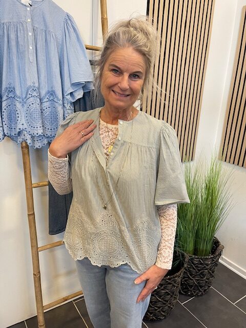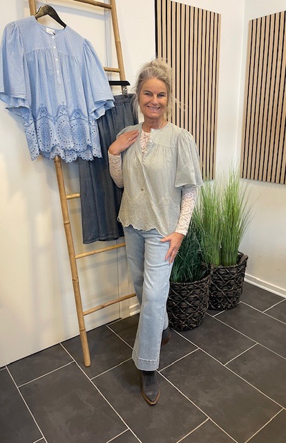 Feminin stribet bluse med broderi fra AJ117 Project. Style den til både en pæn buks, til jeans og til en nederdel.