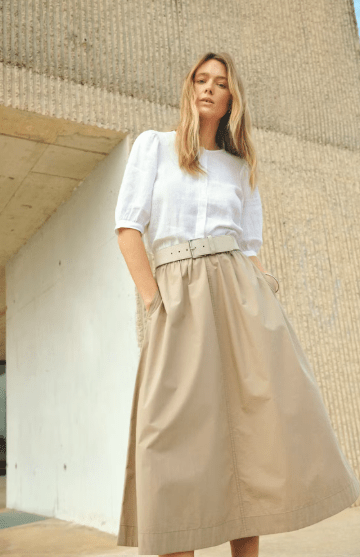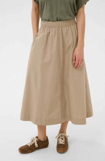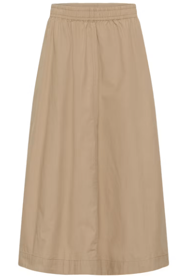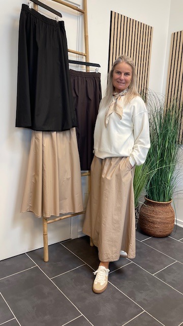 Midi-nederdel med løs, svingende silhuet og elastisk linning. Let look med glat, blød overflade og diskrete læg for naturlig volumen.