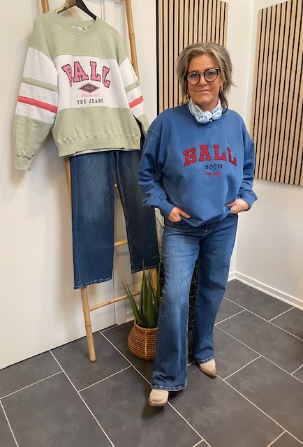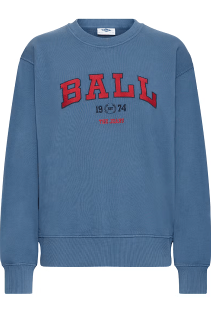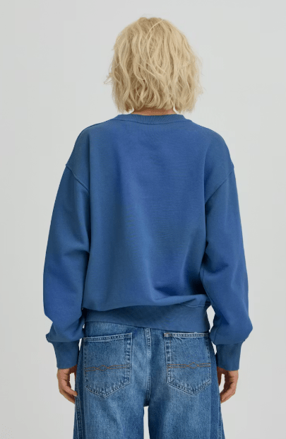 Denne sweatshirt har et lige snit med sænkede skuldre, ribbet rund hals og ribkanter. Hævede bogstaver på brystet giver et afslappet udtryk til den bløde overflade. Den er duset blå med rød skrift. Style den til både bukser og til nederdel.