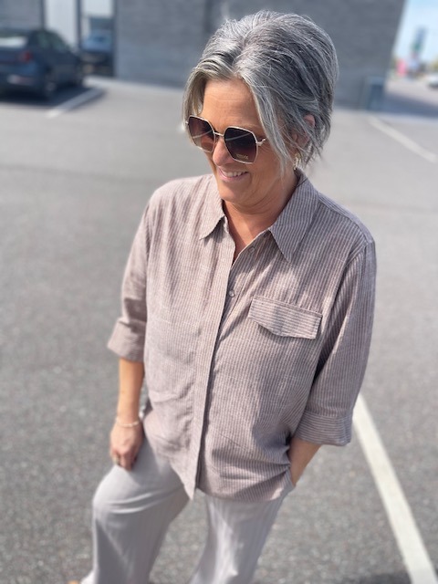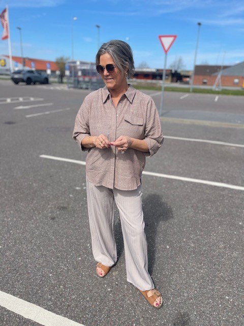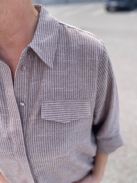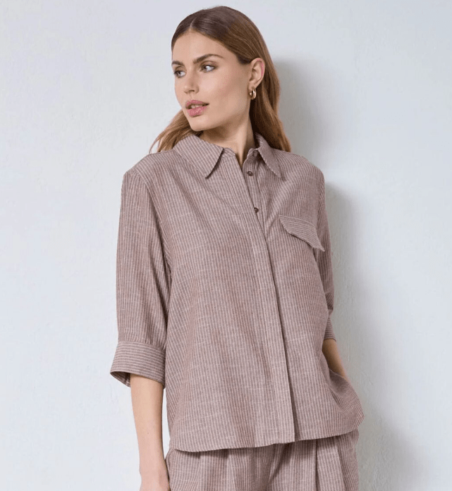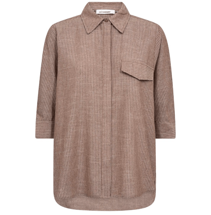 Fineste skjorte i en lækker brun nuance med smalle creme striber fra Co’couture. Skjorten er i en blød og let bomuldsblanding, som falder smukt. Skjorten har den 3/4 ærmer og er lidt længere bagpå en foran. Style den både til bukser, shorts og til en nederdel.