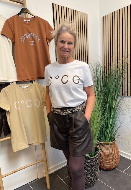 Den skønne Signiature t-shirt fra Co”couture er ganske enkel bare fantastisk. Her er den hvid med mørkebrun skrift.