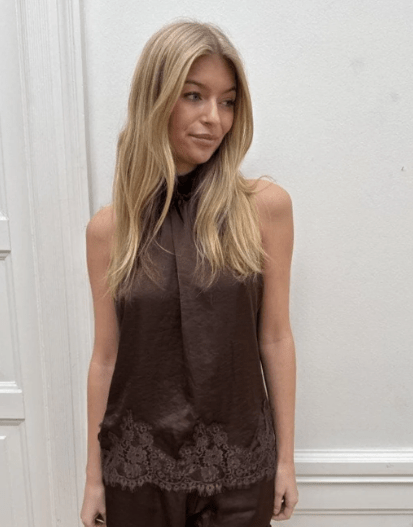 Elegant og feminin top i en eksklusiv satin-kvalitet med smukke blondedetaljer. Toppen har en let, løs pasform og en høj hals med fine rynker, der giver et sofistikeret udtryk. Den bløde, glansfulde overflade tilfører et luksuriøst look, mens blonden langs kanten skaber en romantisk finish. Perfekt både til hverdag med jeans eller til festlige anledninger stylet med en nederdel eller habitbukser. Her er toppen i en flot dyb mørkebrun farve.