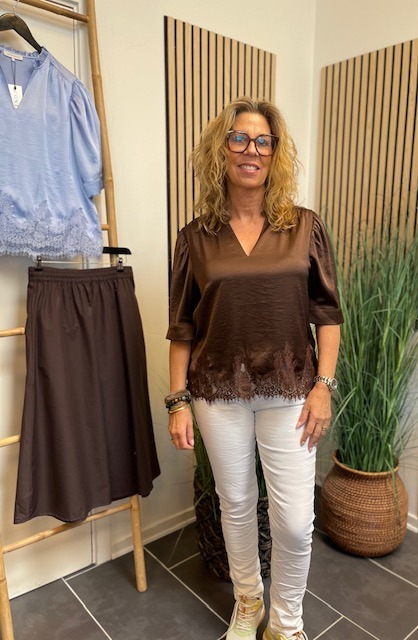 Bluse fra Continue i en lækker coffee brun farve med blondedetaljer ved bunden. Blusen har en skinnende overflade og korte ærmer.
