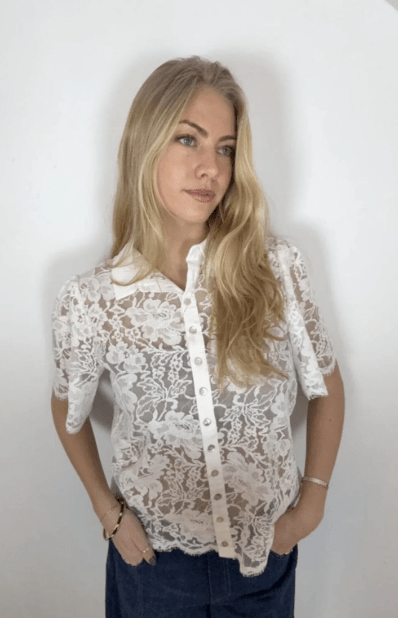 Super sød feminin hvid skjorte i blonder fra Continue. Skjorten har fine korte ærmer. Style den evt. over en top, da den er lidt gennemsigtig.