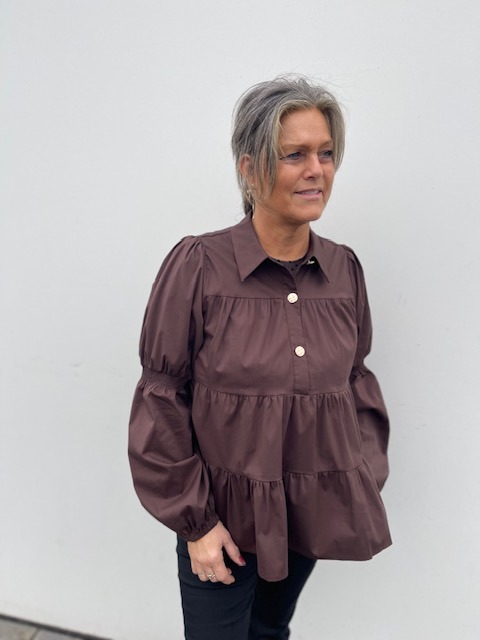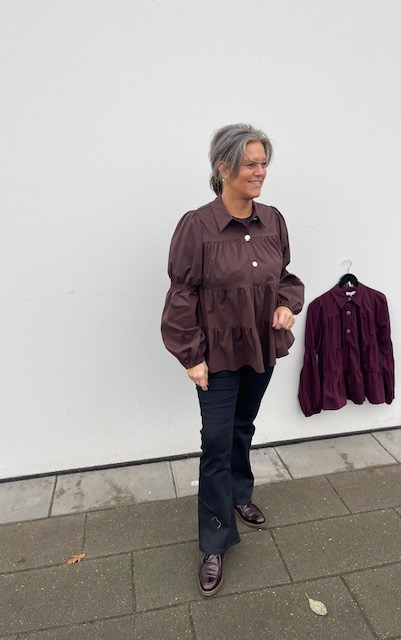 En fin skjorte fra Continue er kommet i denne smukke brune farve. Den er i løs pasform og har denne peplum effekt.. Den er fin til hverdag med et par jeans og til fest til et par pæne bukser eller til en nederdel.