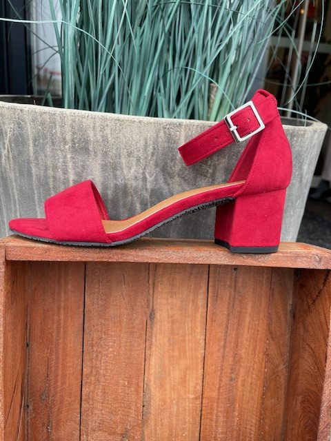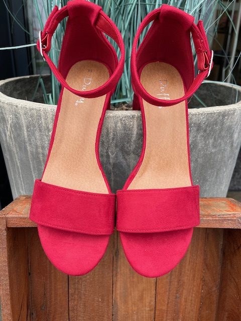 Klassisk sandal i en flot rød farve fra Duffy. Sandalen er på en god bred lille blokhæl og med ankelrem.