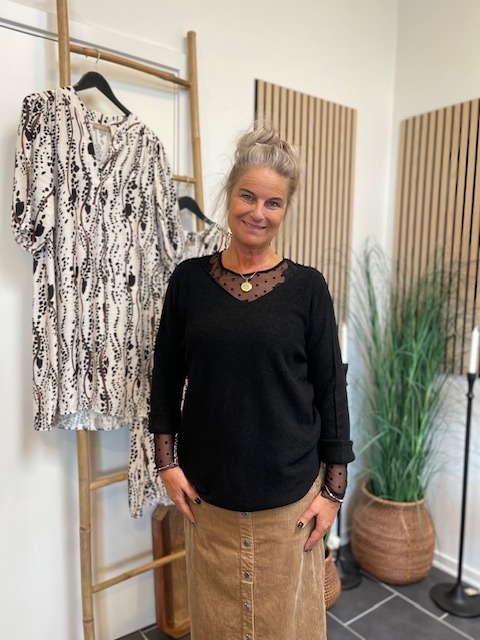 En iøjnefaldende meshtrøje med prikker, der giver et feminint og sofistikeret udtryk. Denne langærmede trøje er perfekt til lag-på-lag eller som et statement-piece, og dens lette materiale sikrer komfort hele dagen.