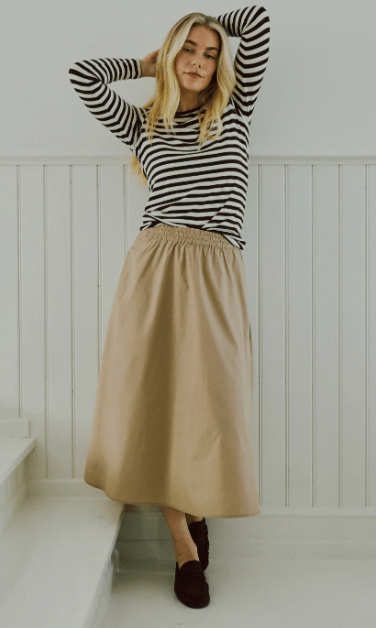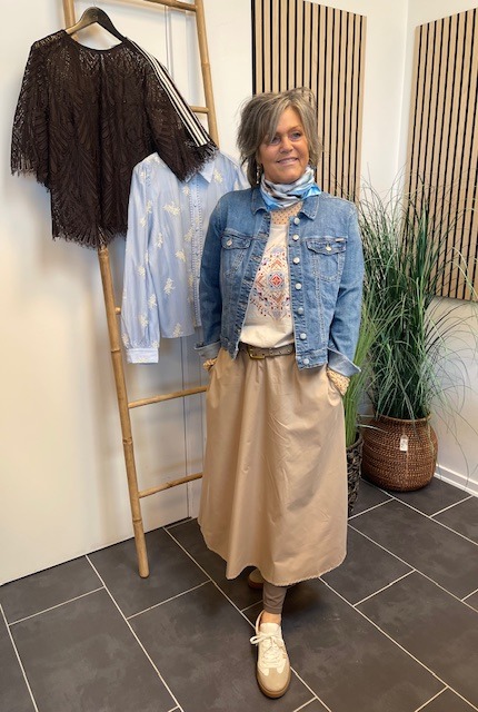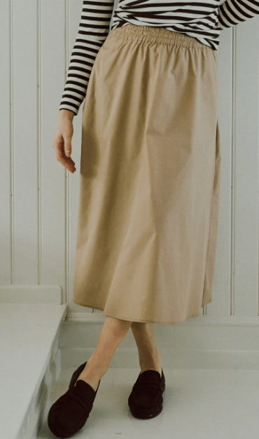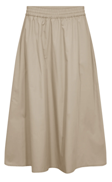 Skøn beige farvet nederdel fra Freequent. Den har en god længde, som IKKE er for lang. Der er elastik i taljen og lommer i begge sider.
