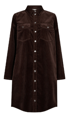 Super smart mørkebrun kjole i fløjl fra Freequent. Kjolen har krave og den er gennemknappet.