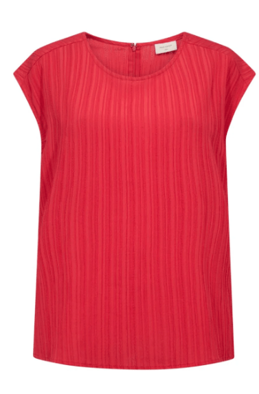 Plisseret bluse fra Freequent i en flot rød farve. Modellen har rund hals, korte ærmer og en let, løs pasform og den er nem at style til både bukser, shorts og til en nederdel.