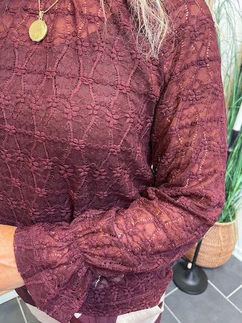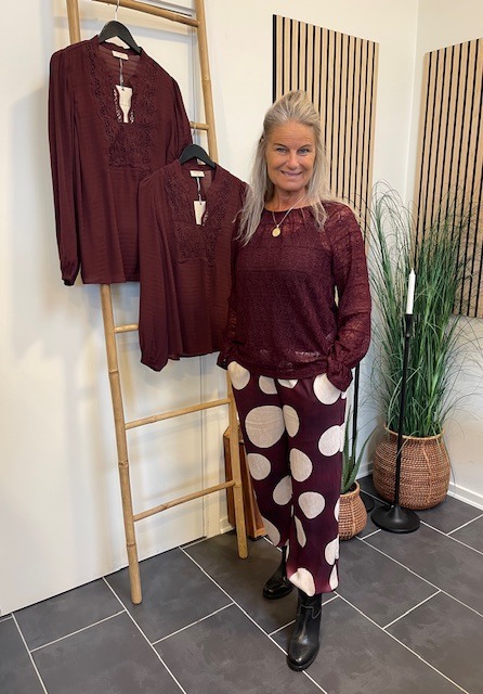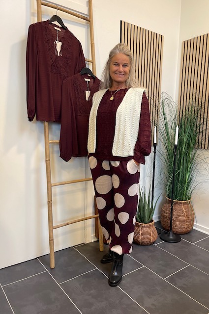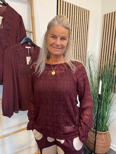 Flot bordeaux farvet blonde bluse fra Freequent. Style den til både bukser og til nederdel. Den er lidt gennemsigtig, så style den over en top.