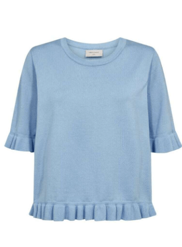 Pullover i lyseblå fra Freequent i en blød, finstrikket kvalitet. Pulloveren er enkel i modellen med en rund halsudskæring, trekvartlange ærmer, flæsekanter samt en skøn, løs pasform.