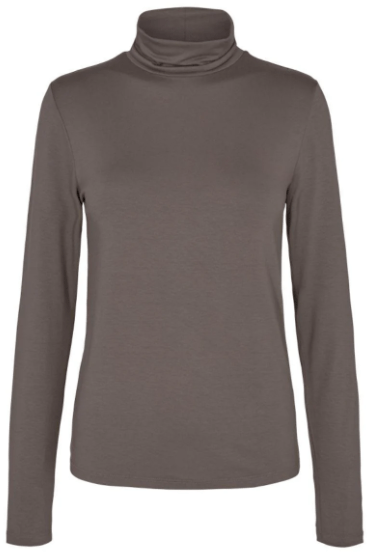 Skøn basis bluse med høj hals i en flot sand/nougat farve fra Freequent. Perfekt at style under en vest, under dine kjoler og på de kølige dage også under en strik.