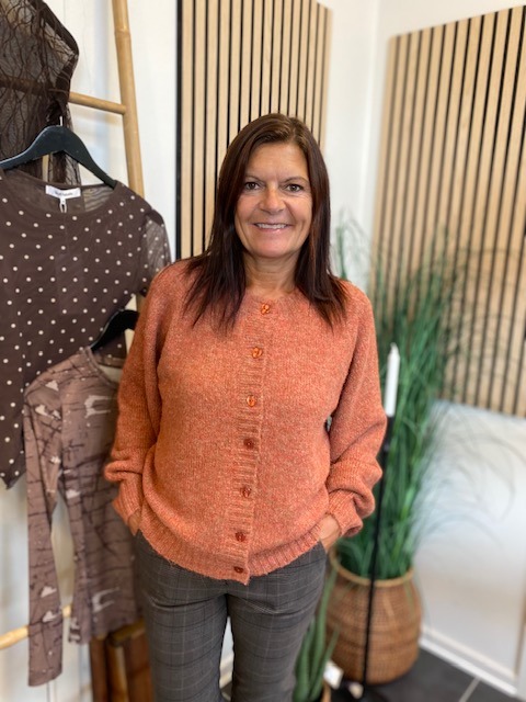 Lækker cardigan i en flot orange/rust farve fra Freequent. En populær strik som vi har i flere flotte farver.