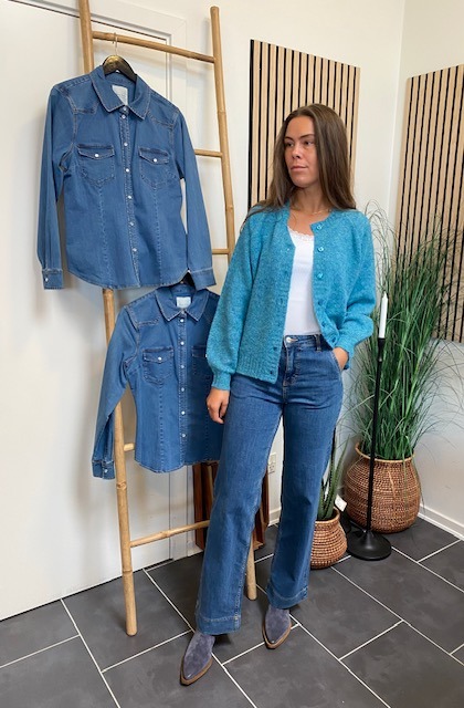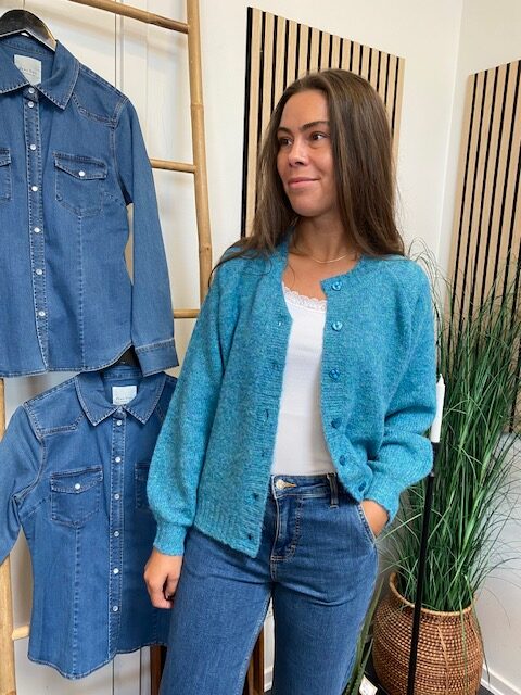 Den skønne Louisa cardigan i en flot turkis blå farve fra Freequent. En populær model som vi har i flere flotte farver.