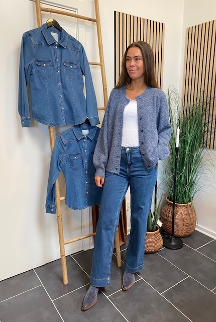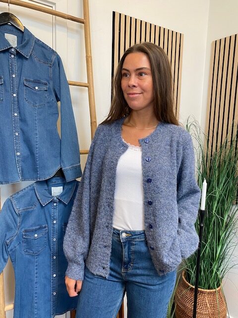 Den skønne klassiske strik cardigan style Louisa i en flot dueblå farve fra Freequent. En populær cardigan som vi har i flere farver.
