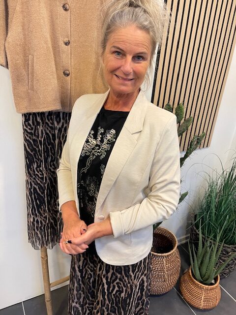 Lys blazer fra Freequent i en blød og stretchy kvalitet. Jakken er enkel i modellen med stofknapper på fronten og de lange ærmer, V-udskæring med revers, diskrete sidelommer samt en elegant, figursyet facon.