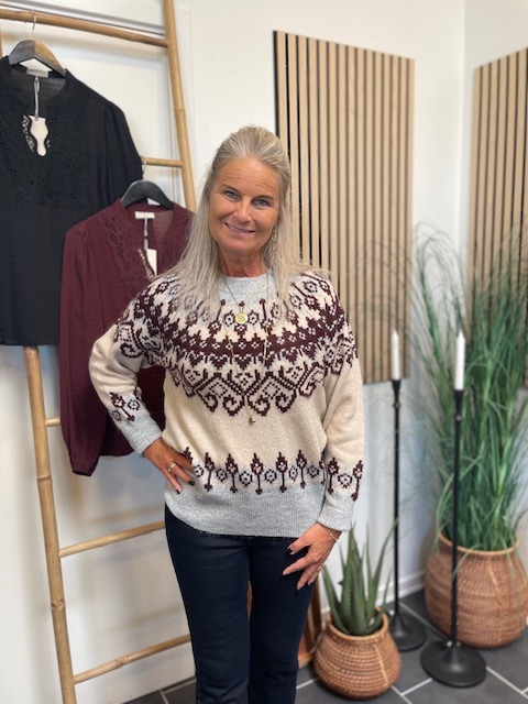 Lækker strik i et flot norsk inspireret mønster fra Freequent. Den er grå/offwhite/bordeaux og den kradser IKKE.