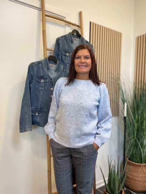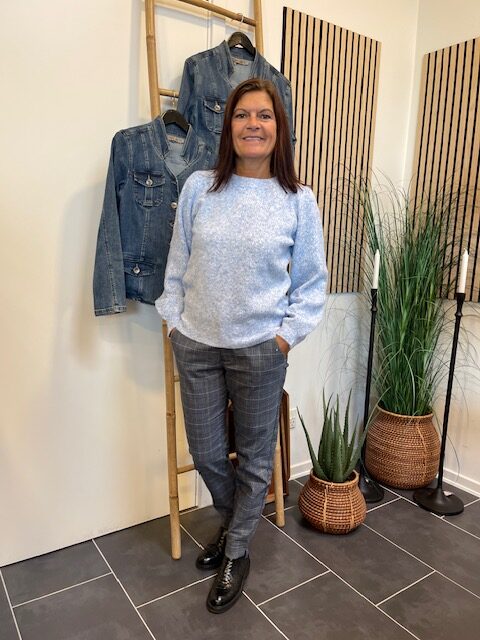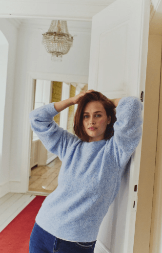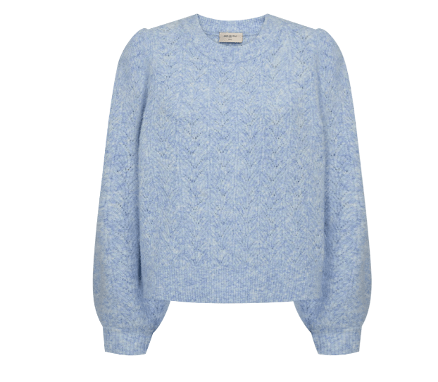 Pullover i lyseblå fra Freequent i en blød, strikket kvalitet med et flot strukturmønster. Pulloveren har lange pufærmer, ribkanter, en rund halsudskæring samt en elegant, løs pasform.