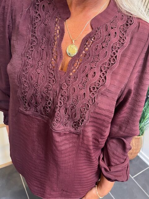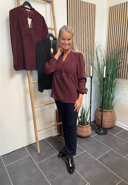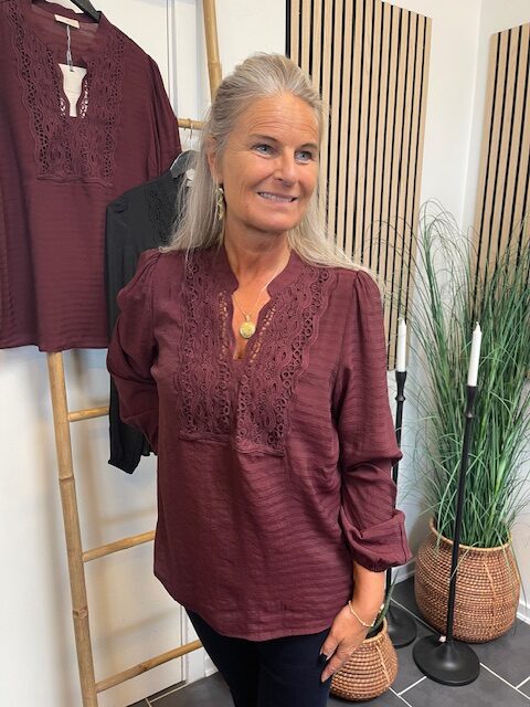 Bordeaux bluse fra Freequent i lækker viskoseblanding. Den fine bluse er flot at style til både bukser og til nederdele.