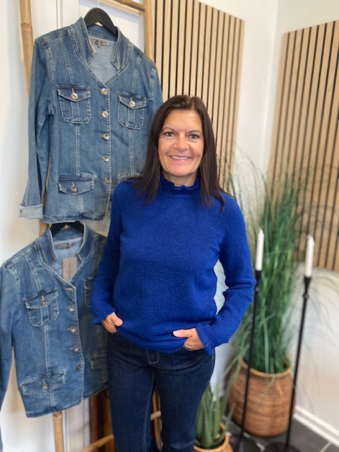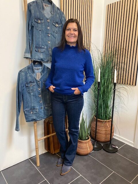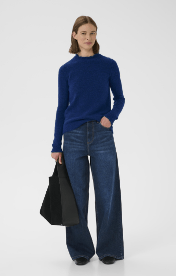 Lækker strik i en flot blå farve og med en flot hals fra Inwear. Style den til både bukser og til en nederdel.