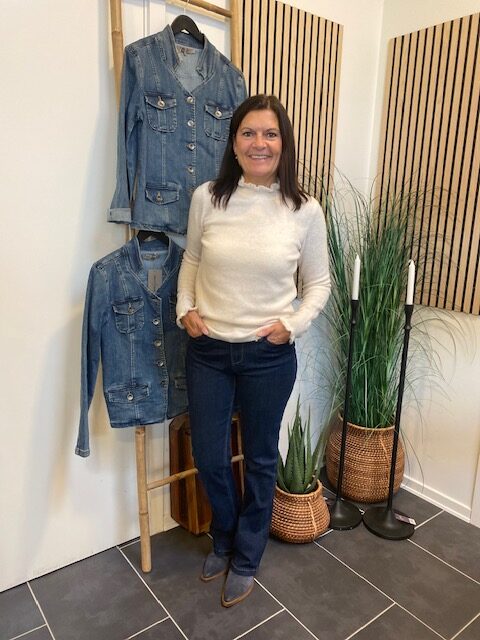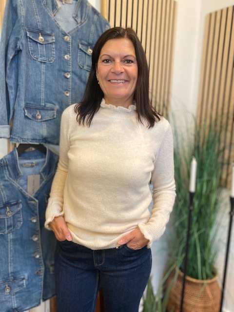 Skøn cremefarvet strik med en fin hals fra Inwear. Style den til både bukser og til nederdel.
