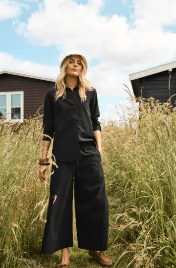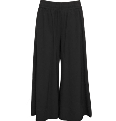 Elegant sort buks med meget vidde i en let og behagelig kvalitet fra Costa Mani. Buksen har elastik i talje med et bindebånd. En tidløs style, som nemt kan dresses op eller ned til både hverdag og fest.