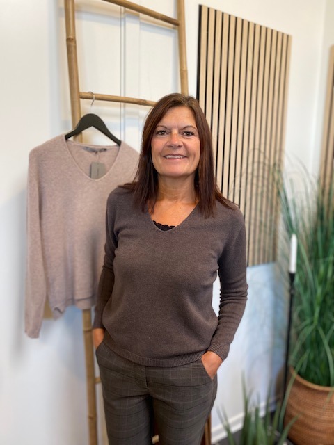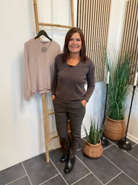 Super blød brun strik med v-udskæring fra Costa Mani. Nem hverdags strik, som IKKE kradser.