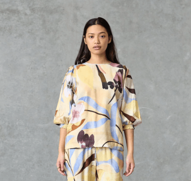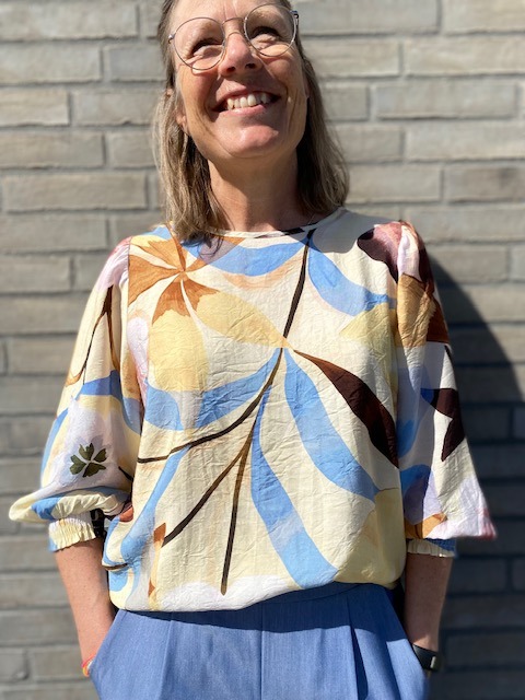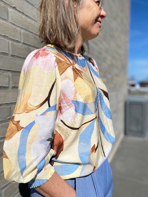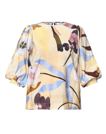 Bluse fra Love & Divine i farven Antique Flower med blomsterprint i gule, blå, rosa og lilla toner på en lys baggrund. Blusen er nem at style til både bukser, shorts og til en nederdel.