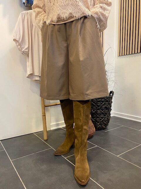 Love1297 er et par bermuda shorts med en løs pasform og bredde i benene i en flot sandfarve, som ender omkring knæene. Shortsne har en høj talje med bæltestropper. Style dem nu over strømpebukser og med bare ben til sommer.