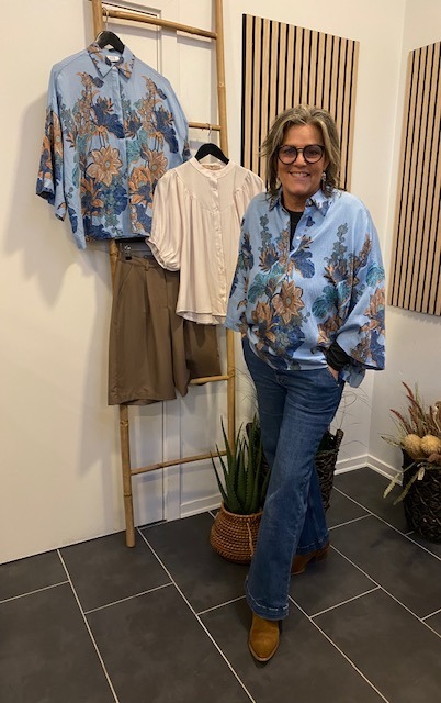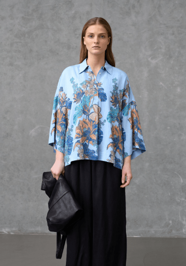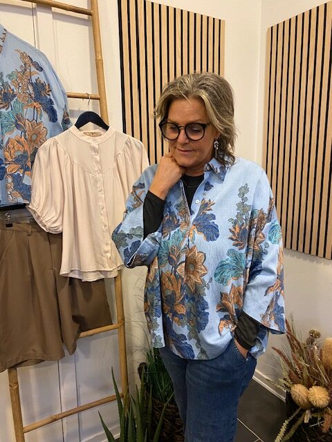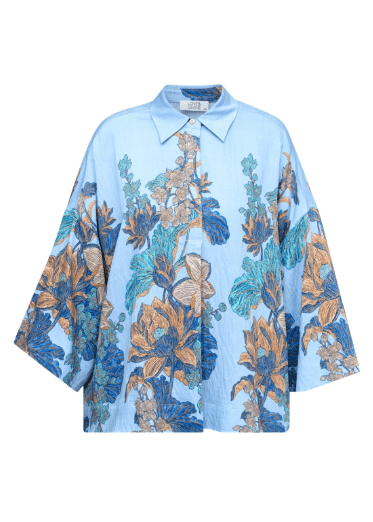 Love1553 er en luftig skjorte i et afslappet oversized snit med et kunstnerisk botanisk print. Skjorten har lave skuldersømme, brede trekvartærmer og en klassisk krave.