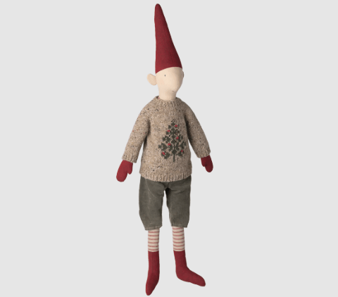 Mailegs Pixy-nisser er klassiske julefigurer, der bringer hygge og tradition ind i hjemmet. Denne Pixy i størrelse 5 er en dreng iført en strikket sweater med juletræ. Med en højde på ca. 90 cm er han en markant figur, der skaber blikfang i julepynten – perfekt til at stille ved siden af juletræet, i entréen eller som del af en større opstilling. Nissen er fremstillet i bløde tekstiler med håndlavede detaljer, hvilket gør hver nisse unik. En dekorativ nisse, der kan bringes frem år efter år som en fast del af julens traditioner.