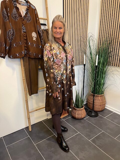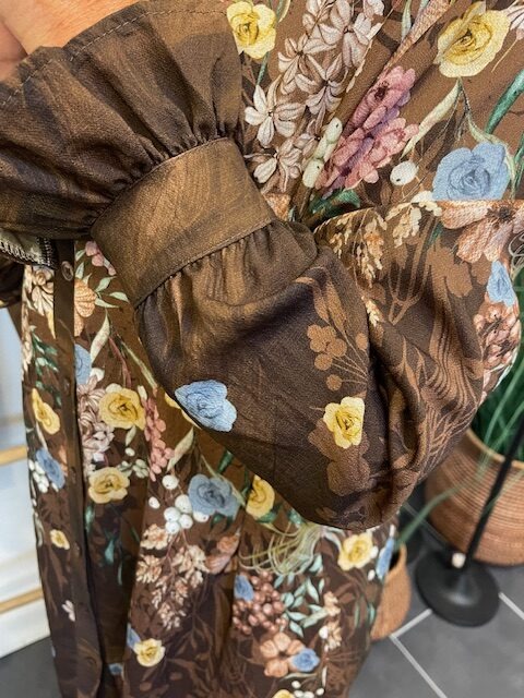 Skøn kjole fra Marta. Den er brun med et flot blomsterprint i flotte farver. Style den over et par strømpebukser eller over et par bukser.