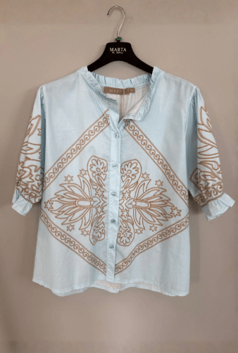 Skøn bluse i sart mint med et nougat farvet print fra Marta. En nem bluse til både bukser, shorts og til en nederdel.