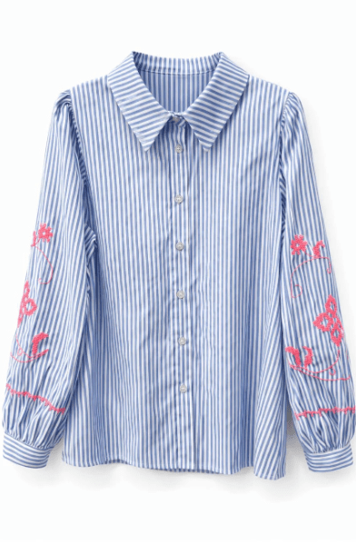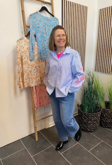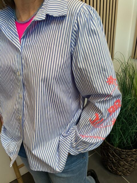 Moderigtig skjorte fra Marta. Den er blå/hvid stribet og med broderi på ærmerne. Brug den endelig også åben over en t-shirt.