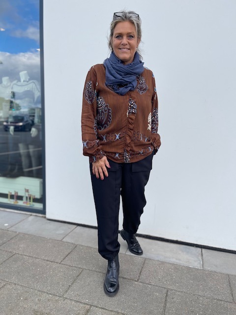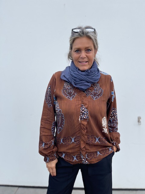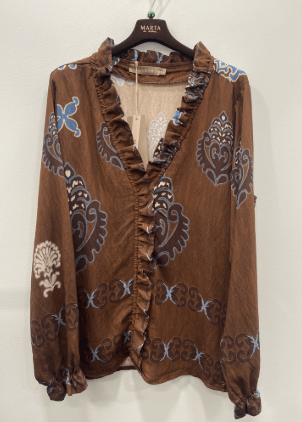 Brun skjorte fra Marta Du Chateau med paisley-mønster i blå og offwhite nuancer. Skjorten har en løs pasform med V-hals og rynkede detaljer langs frontåbningen. Den er nem at style til både nederdel og til bukser.