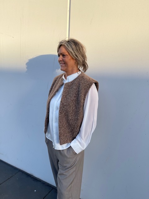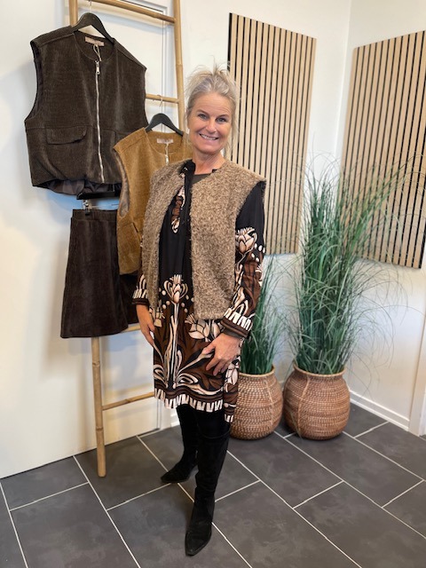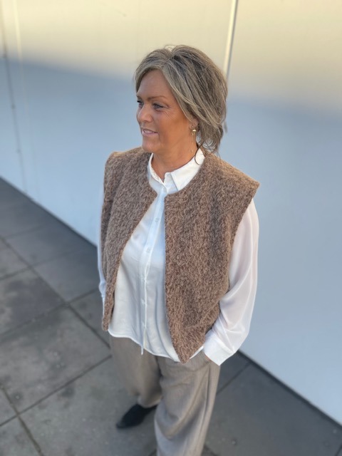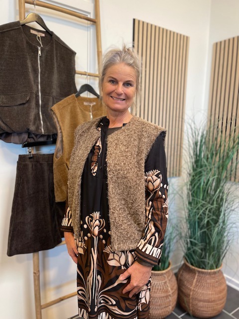 Moderigtig brun vest uden knapper fra Marta. Style den over dine kjoler, en skjorte og over en langærmet t-shirt.