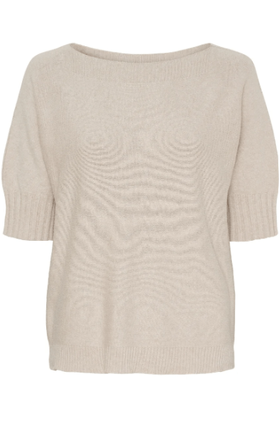 Elegant og tidløs strik fra Marta du Château i en lys beige farve. Strikken er one-size med en let pasform. Den har en rund bådudskæring og korte ærmer med bred ribkant. Strikken er en alsidig style i garderoben, som nemt kan styles med enten bukser eller nederdel.