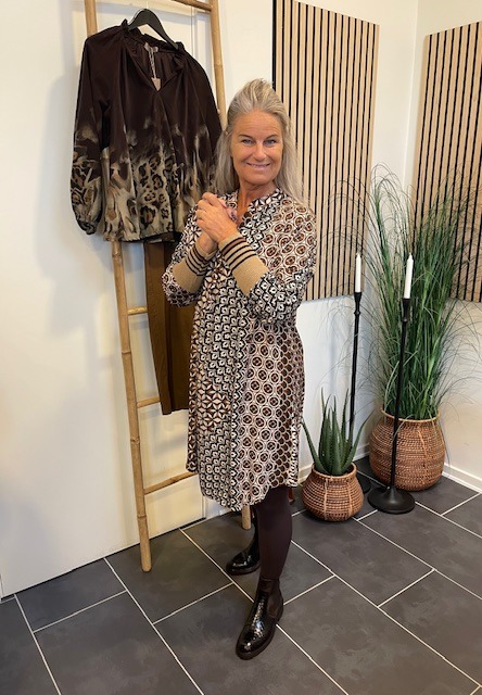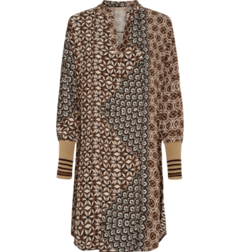 Super fin kjole fra Marta Du Château i et unikt print. Kjolen har V-udskæring med en lille krave og ribkant ved ærme. Style den med et par strømpebukser og sneakers eller en støvle for et finere look.