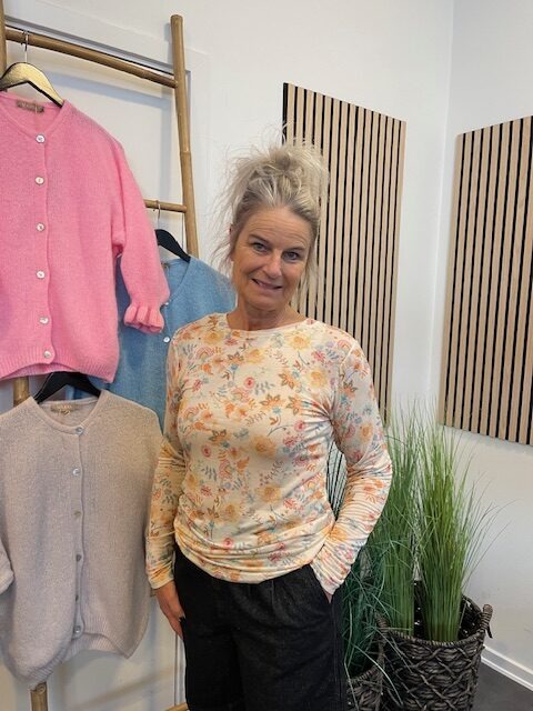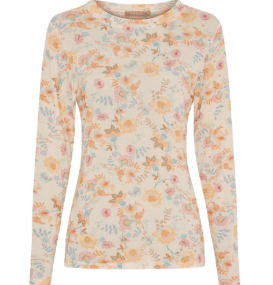 En fantastisk bluse i lækker tynd kvalitet i beige med blomster. Rund hals og lange ærmer. Denne t shirt er tænkt som den “nye mesh”, brug den under strik, bluser, kjoler – kort sagt den kan du style under alt.