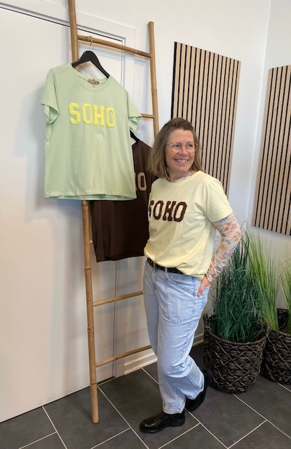 Skøn gul t-shirt med brun skrift foran fra Marta. Style den til både bukser og til nederdel.