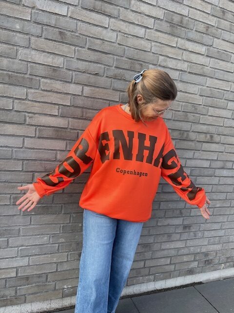 Den populære Marta sweat i orange med brun skrift. Den er oversize og er lidt til den store side.