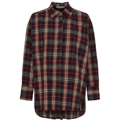 Oversize skjorte i fine tern med skønne farver og med den moderigtige bordeaux. Kan bruges både åben og lukket med gennemgående knapper.