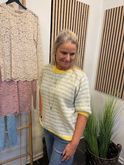 Kortærmet strikbluse med vandrette striber i mintgrøn og offwhite fra Marta. Strikken har gule ribkanter ved hals, ærmer og bund tilføjer et friskt touch. Den er nem at style til både jeans, bukser og til en nederdel.