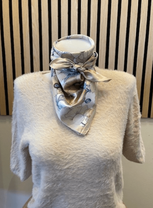 Fint lille tørklæde i beige/lyseblå blomsterprint fra Marta.