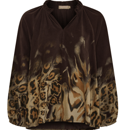 Sød bluse fra Marta du Château i et flot print i brune farver. Blusen er V-halset med flæse detalje og lidt længere bagtil end foran. Den kan styles med både jeans og sneakers for et hverdags outfit, eller en nederdel og en støvle til finere brug.