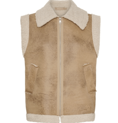 Super cool beige farvet vest fra Marta Du Château i læderlook og med teddyfoer. Den har gode lommer front, samt lynlås og krave. Vesten kan bruges udover en bluse eller strik, som er helt perfekt her til efteråret.
