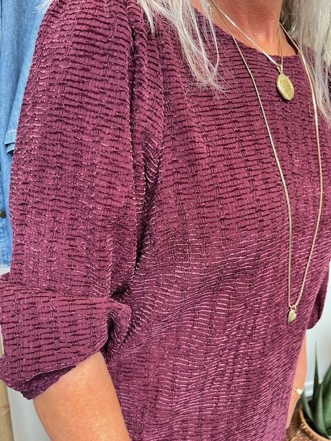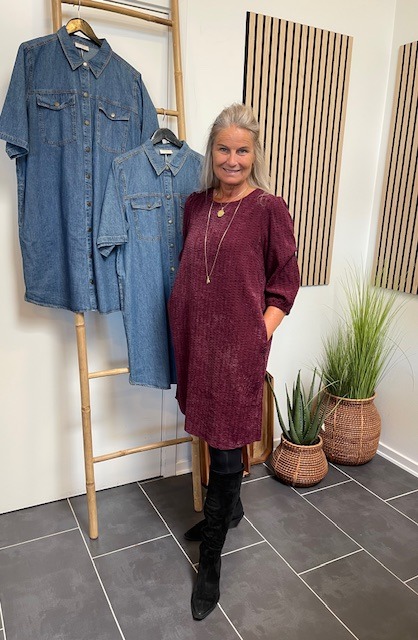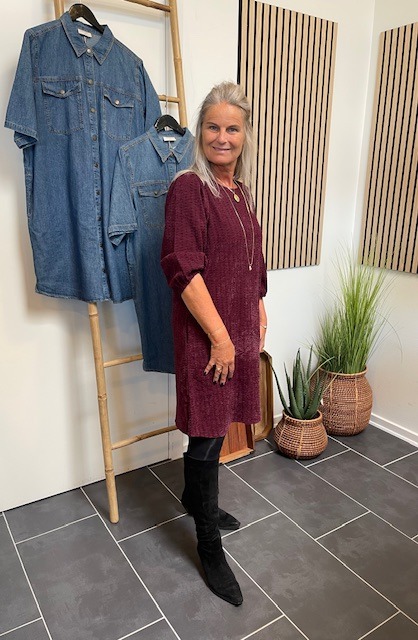 Kjole i en flot dyb bordeaux farve fra Freequent i en superblød kvalitet med en smuk struktur. Derudover har kjolen trekvartlange ballonærmer med elastik cuff, en rund halsudskæring, lynlåslukning bagpå samt en elegant A-facon. Style kjolen over et par stramme jeans eller et par tykke strømpebukser.
