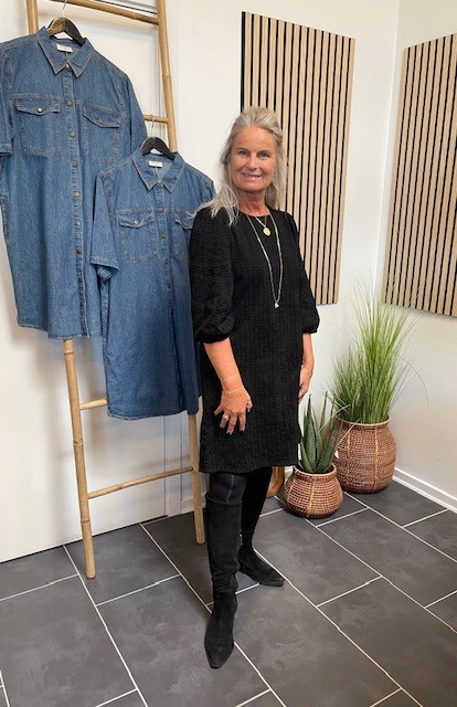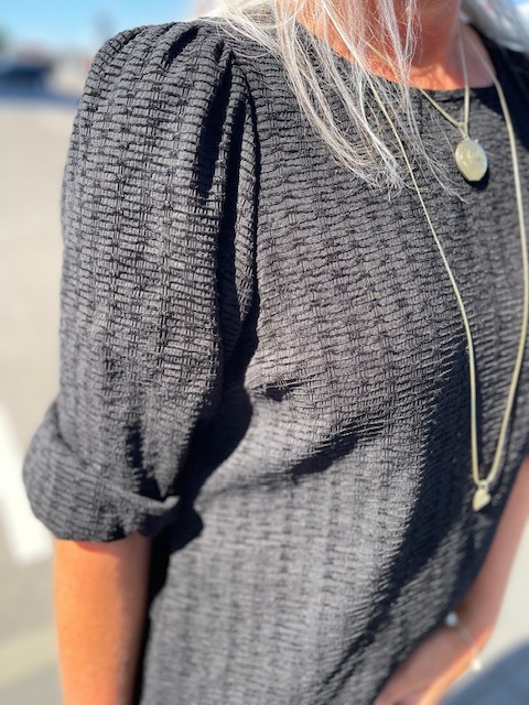 Sort kjole fra Freequent i en superblød kvalitet med en smuk struktur. Derudover har kjolen trekvartlange ballonærmer med elastik cuff, en rund halsudskæring, lynlåslukning bagpå samt en elegant A-facon. Style kjolen over et par stramme jeans eller over et par tykke strømpebukser.